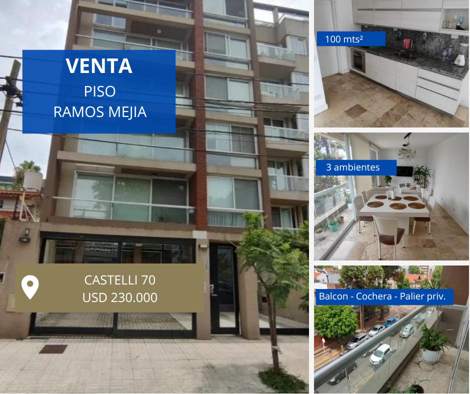 PISO DE 3 AMBIENTES CON COCHERA, PALIER PRIVADO, COCHERA EN SUBSUELO CON RAMPA PARA CAMIONETA, EDIFICIO CON ASCENSOR DE ULTIMA GENERACION, 100 MTS TOTALES, AMPLIO ESTAR COMEDOR, COCINA SEMI INTEGRADA, PISOS PORCELLANATO, ABERTURAS DVH Y BALCON CON VISTA A LA CALLE, TOILETTE DE VISITAS, LAVADERO CUBIERTO, DOS DORMITORIOS AMPLIOS EN SUITE. VENTA DIRECTA TOMA PERMUTA EN MITAD DE VALOR EN ZONA RAMOS MEJIA.