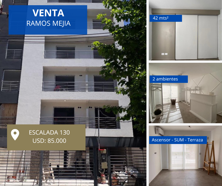 HERMOSO DEPARTAMENTO DE 2 AMBIENTES DE 42 MTS APROXIMADOS, UBICADO CON VISTA AL CONTRAFRENTE, AMPLIO LIVING COMEDOR CON COCINA INTEGRADA, BAÑO COMPLETO CON DUCHA, DORMITORIO CON PLACARD E INTERIORES Y BALCON, EL EDIFICIO CUENTA CON ASCENSOR, SUM Y TERRAZAS DE USO COMUN, INMEJORABLE UBICACION CERCANA A LA ESTACION DE TREN. VENTA DIRECTA, NO TOMA PERMUTA.
